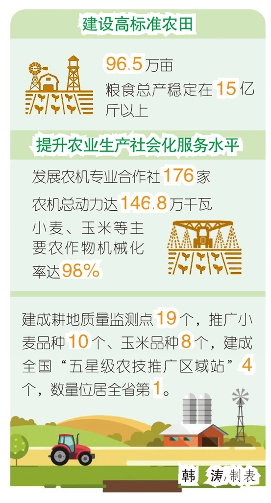 守好“粮袋子”,稳住现代农业基本盘。方城县成立以县委书记任政委、县长任组长的粮食安全工作领导小组,全面落实粮食生产各项工作任务,建立健全联席会议机制,坚持全县“一盘棋”,加强统筹协调和指挥调度。强化稳定粮食生产、保障粮食安全、防灾减灾等措施,全方位夯实粮食安全根基。建成高标准农田96.5万亩,粮食总产稳定在15亿斤以上。与国有企业合作,创新高标准农田“投、融、建、运、管”一体化模式,规划2024—2028年建设高标准农田示范区10万亩,通过示范带动,逐步将永久基本农田全部建成高标准农田。引导经营主体与村集体深度合作,持续提升村集体收入,为当地农民提供就业岗位,有效解决农田基础设施“有人建,无人管”“效益难发挥”等问题,增强粮食安全保障能力。
