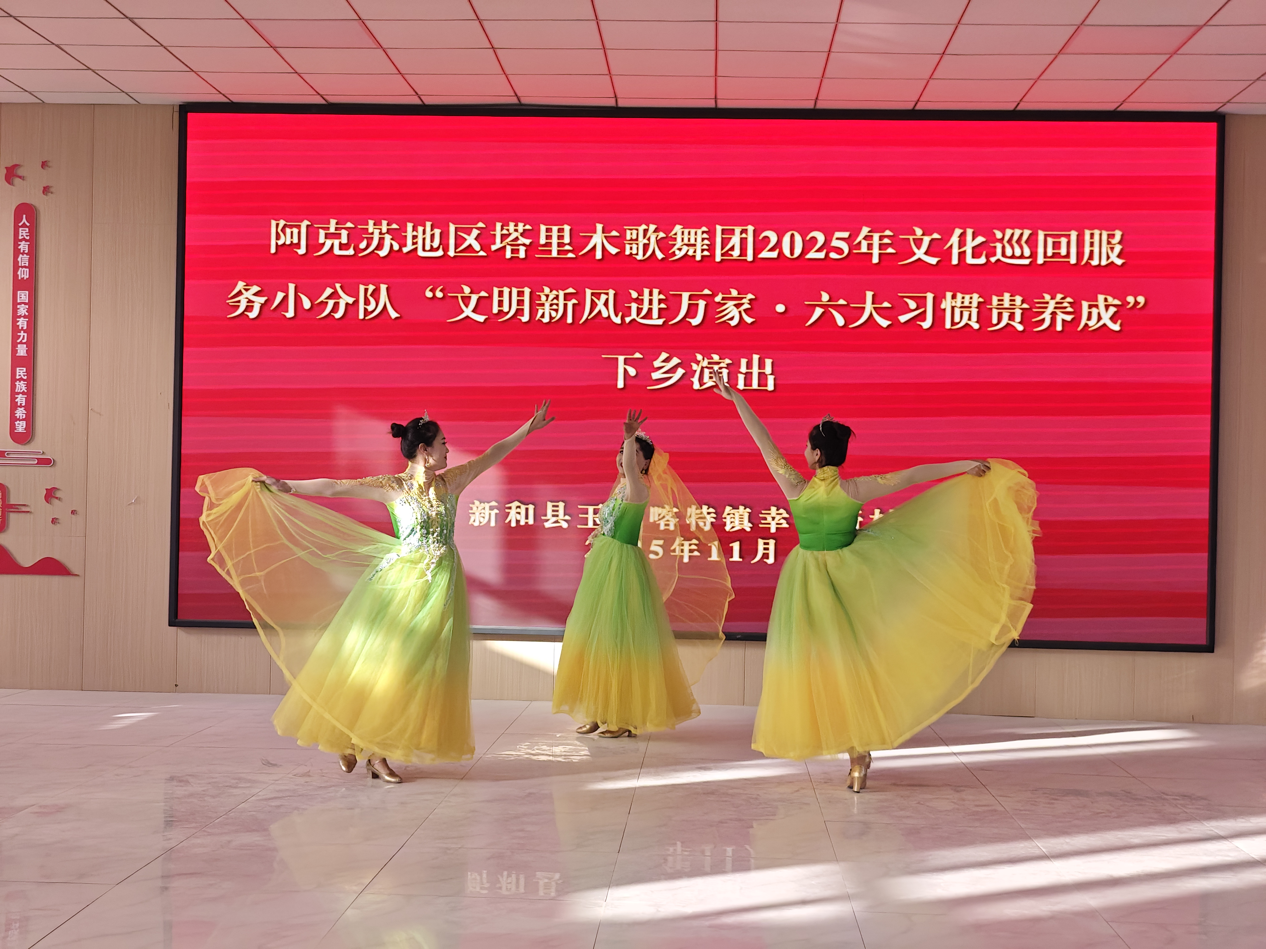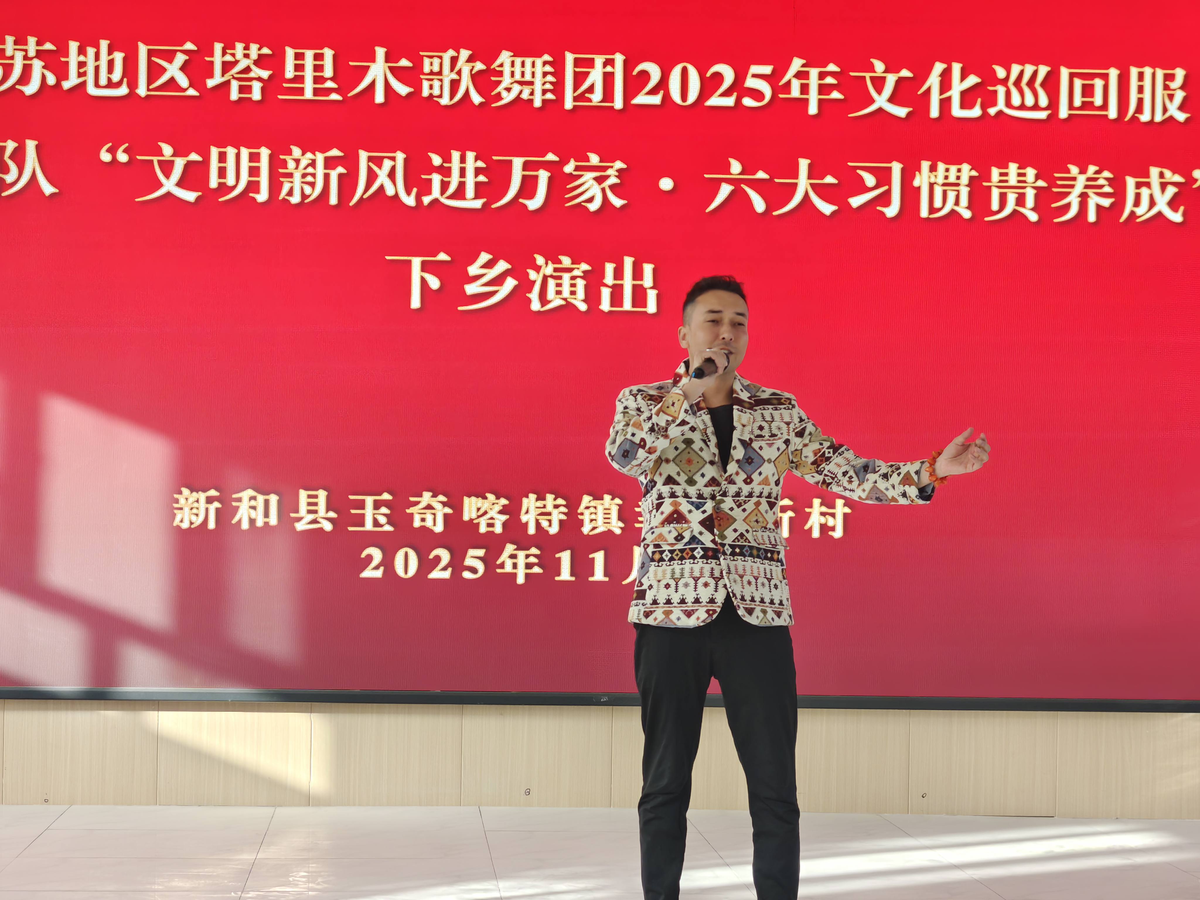 为进一步丰富村民的文化生活,让文明之风吹进百姓的心坎,11月16日,新疆阿克苏地区塔里木歌舞剧团2025年“文明新风进万家·六大习惯贵养成”文化巡回服务小分队带着精心编排的文艺节目走进新和县玉奇喀特镇幸福新村开展下乡惠民演出活动,为村民献上了一场精彩纷呈的文化盛宴。