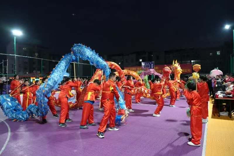 杨店镇小组赛的赛场上,5条色彩艳丽的巨龙在传承人带领下舞动起来,队员们身着统一服饰,踩着篮球比赛的节奏,灵活完成盘旋、翻滚、穿花等动作,龙身鳞片在灯光下鲜艳夺目,尽显“龙灯之乡”的风采。