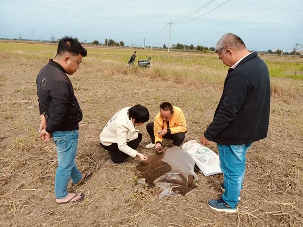 走进地块仔细查看冬季瓜菜备耕有机肥施用情况(陈奇巧 摄)
