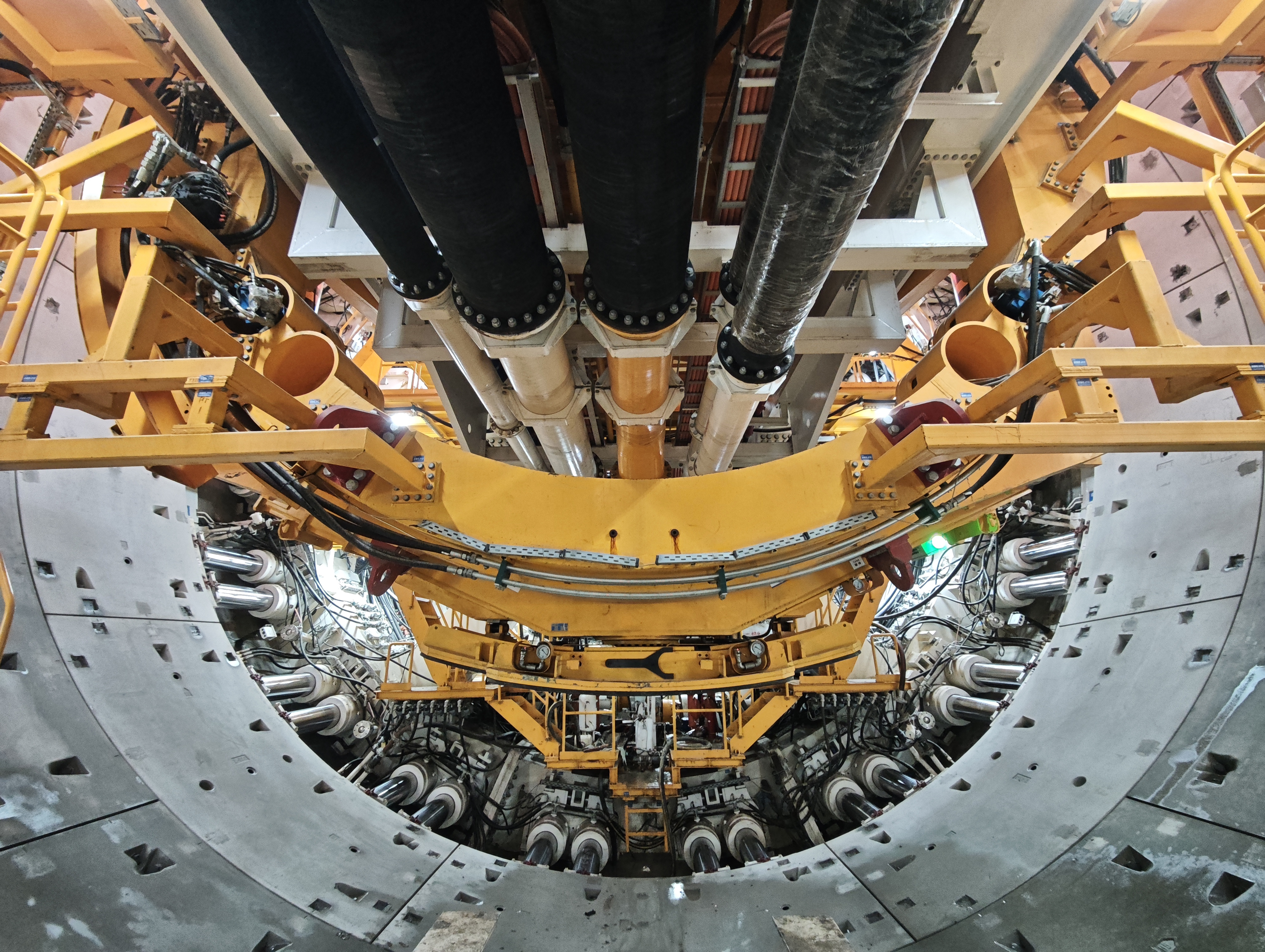 11月25日,在浙江省杭州市,由中国中铁四局集团有限公司(以下简称“中铁四局”)承建的杭州机场高铁站前5标萧山机场西隧道施工现场,14.3米大直径泥水平衡盾构机“启杭号”正在以智能掘进模式稳步向前掘进。