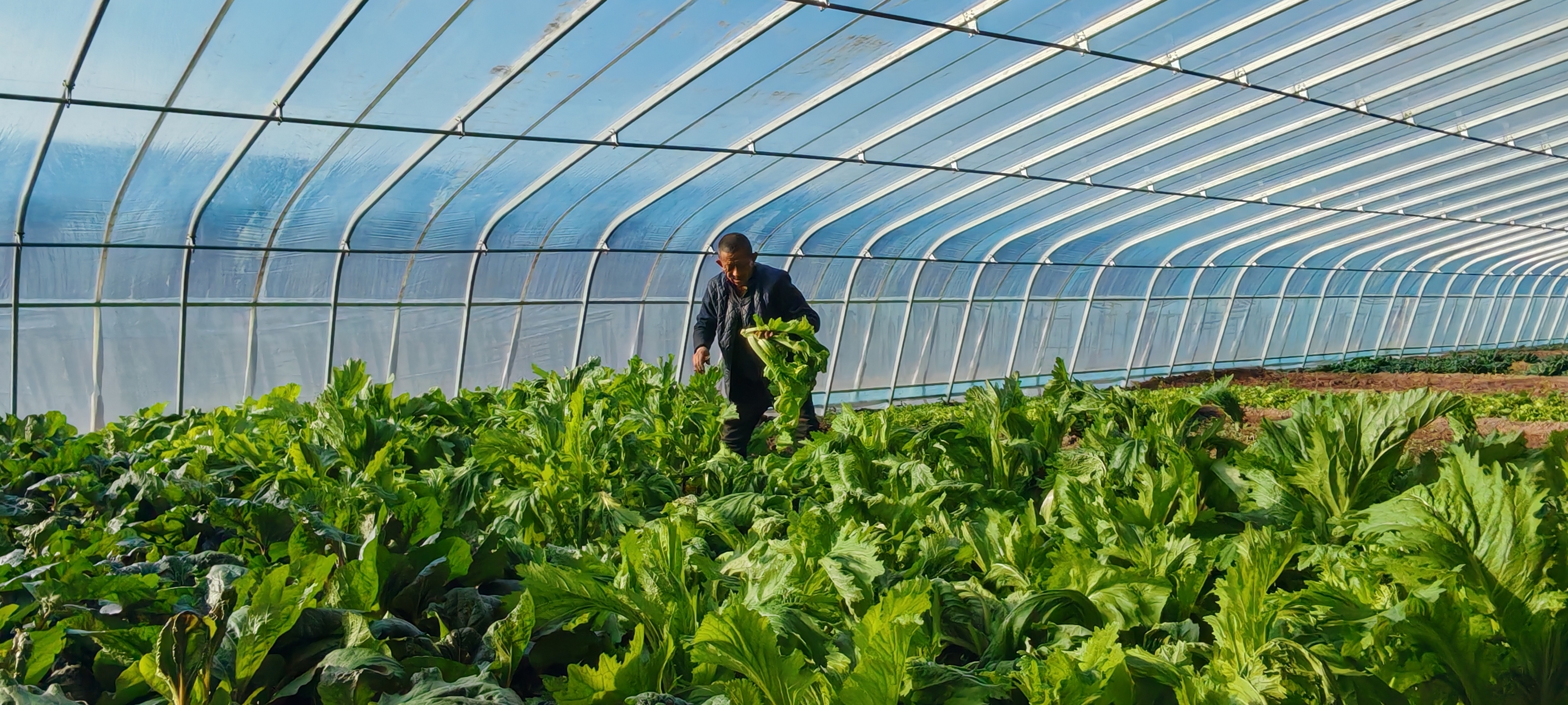 温室大棚里种植户正在采收长势喜人的叶菜(杨润德 摄)