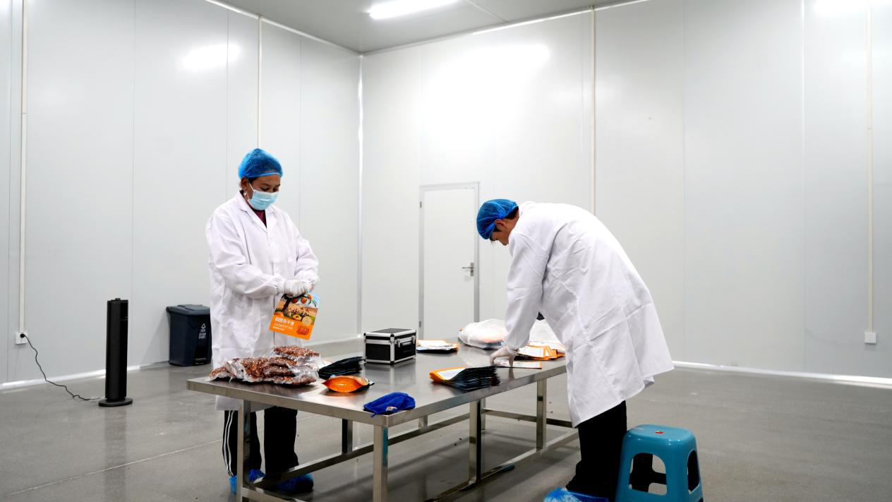 在阿克苏禧洋食品科技有限公司的产品包装车间,工作人员正在封装核桃、吊干杏等产品。(赵新昌 摄)