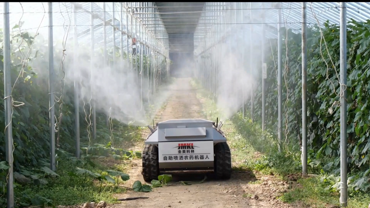 自主喷洒农药机器人在蔬菜大棚穿梭(唐国娇 摄)