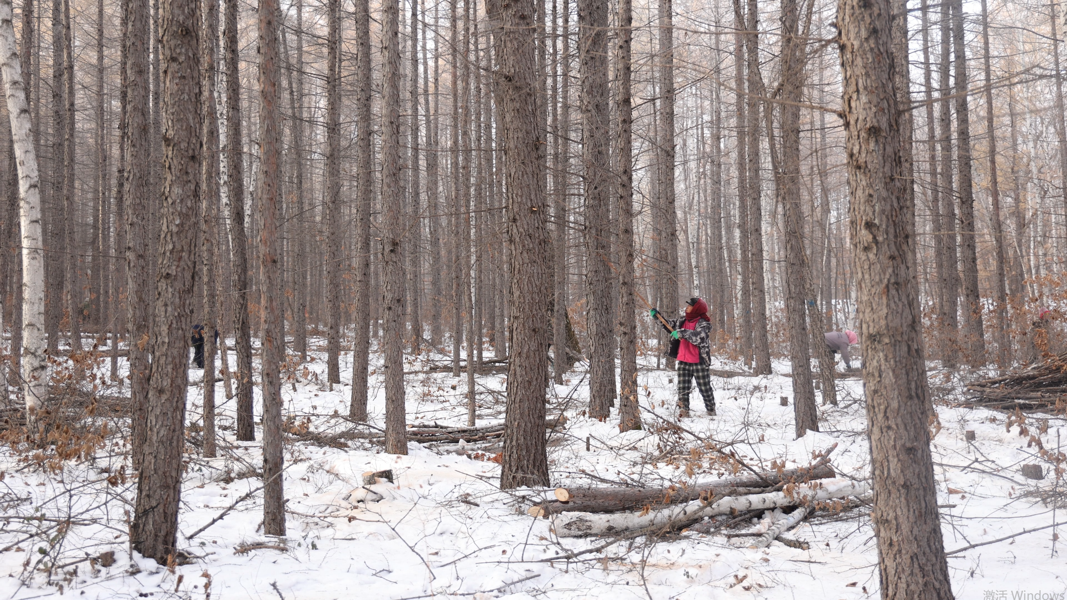 “两人一组,协同作业”是现场的主要工作模式。一人操作机械进行修枝和采伐,另一人紧随其后,将清理出的残枝归集成堆,整齐码放在林间空地。尽管脸颊冻得通红,眉睫挂满白霜,但大家干劲不减。