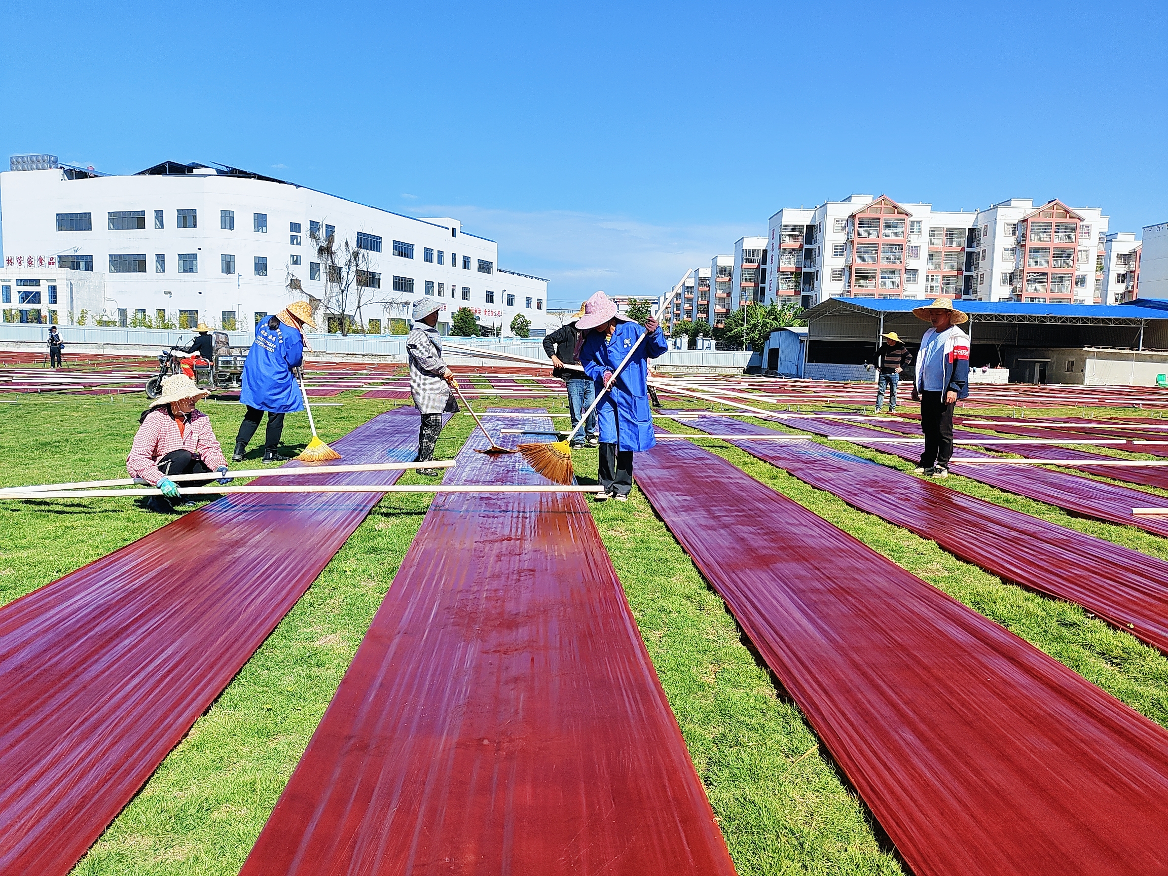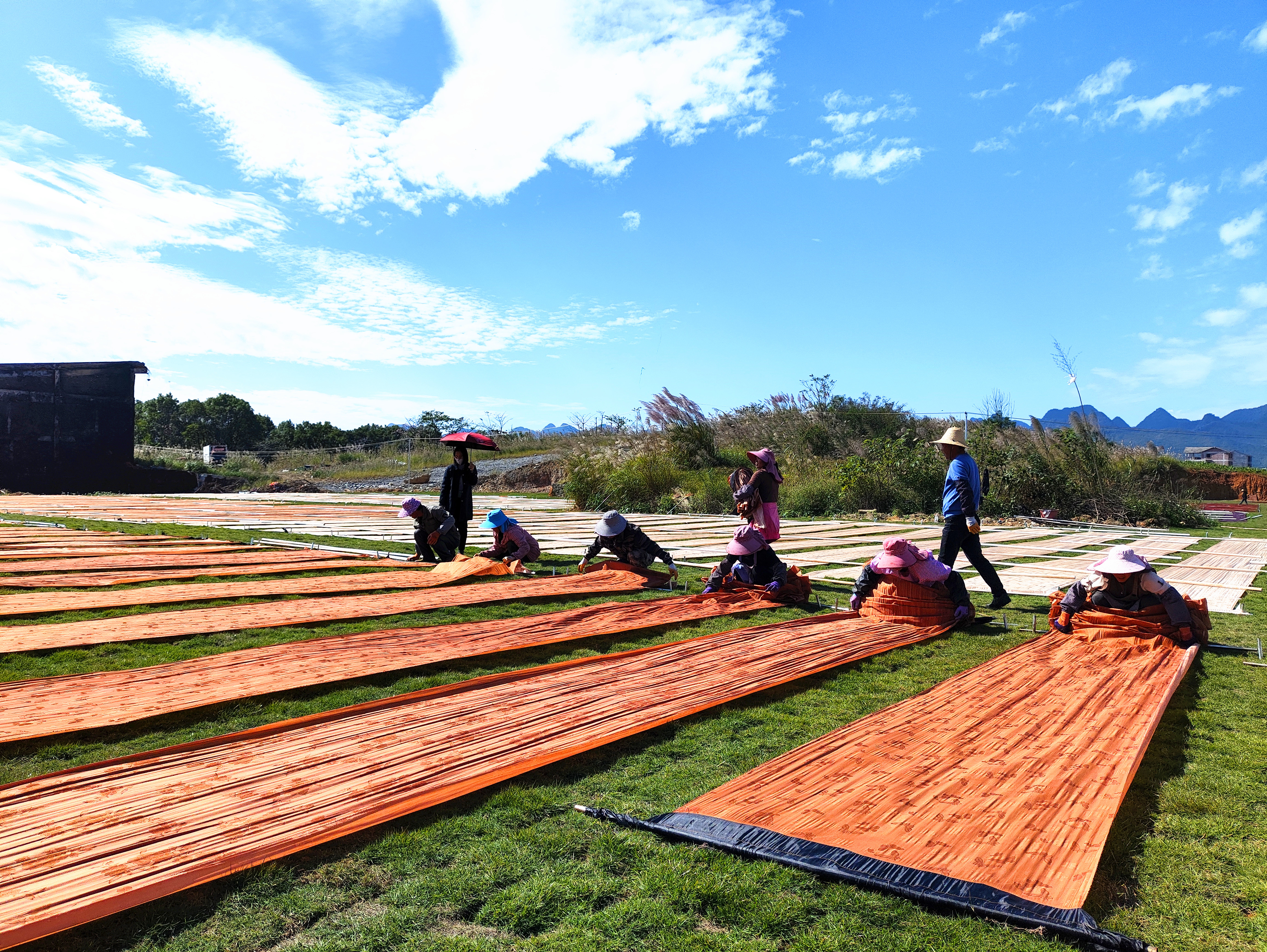 在忻城县高端纺织制造示范园项目现场,工人们正在草地上晒香云纱。(蓝春青 摄)