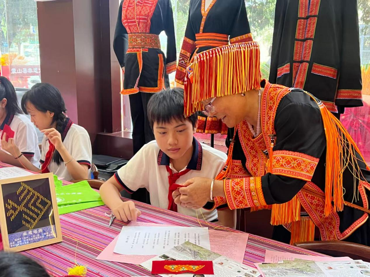 蒙山瑶族刺绣非遗代表性传承人盘家凤手把手教授孩子们行针方法和动作要领(黄晓璐 摄)