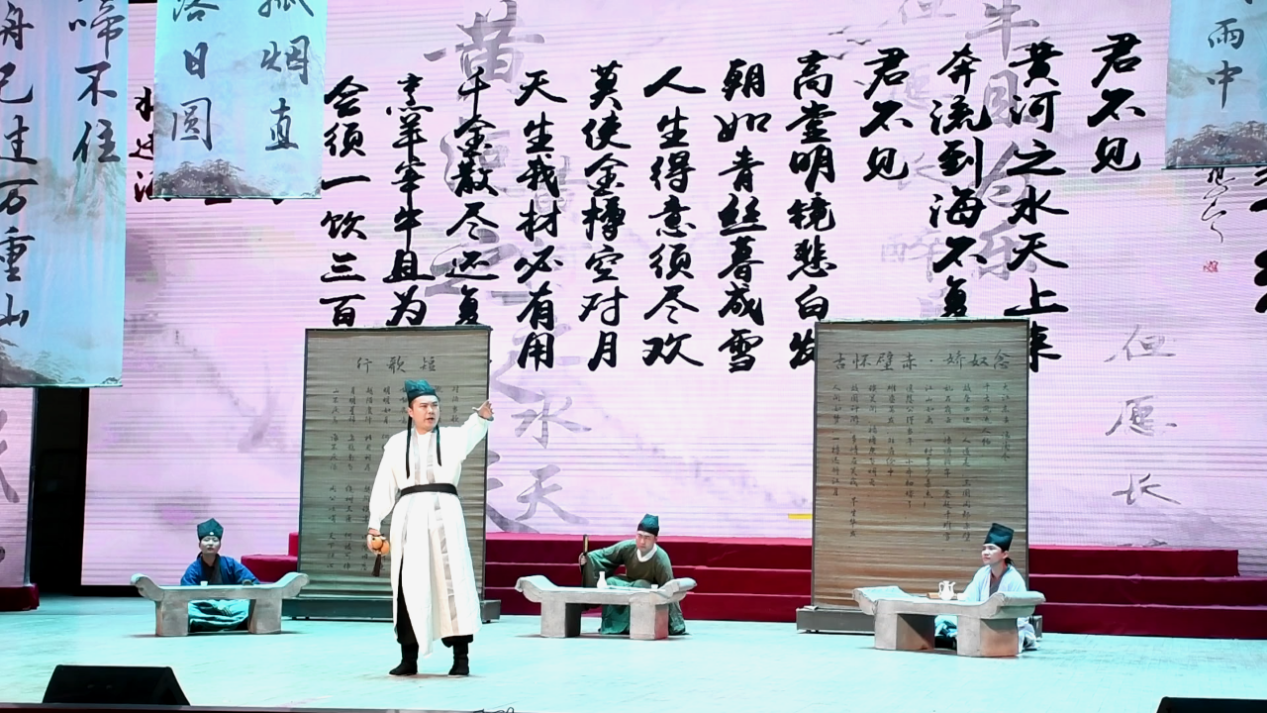 舞台上,李白、王维、杜牧、杜甫四位唐代著名诗人的扮演者围坐品茗、吟诗作对。(柴梦乐 摄)