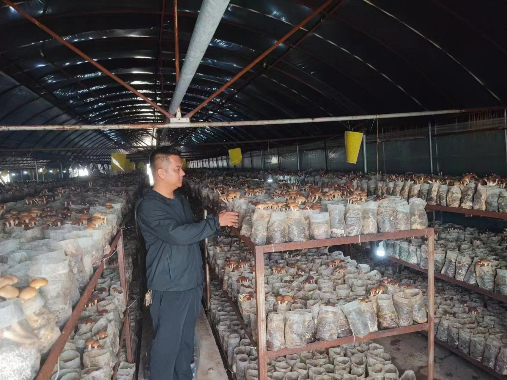 普国荣查看食用菌长势(黄娇 摄)