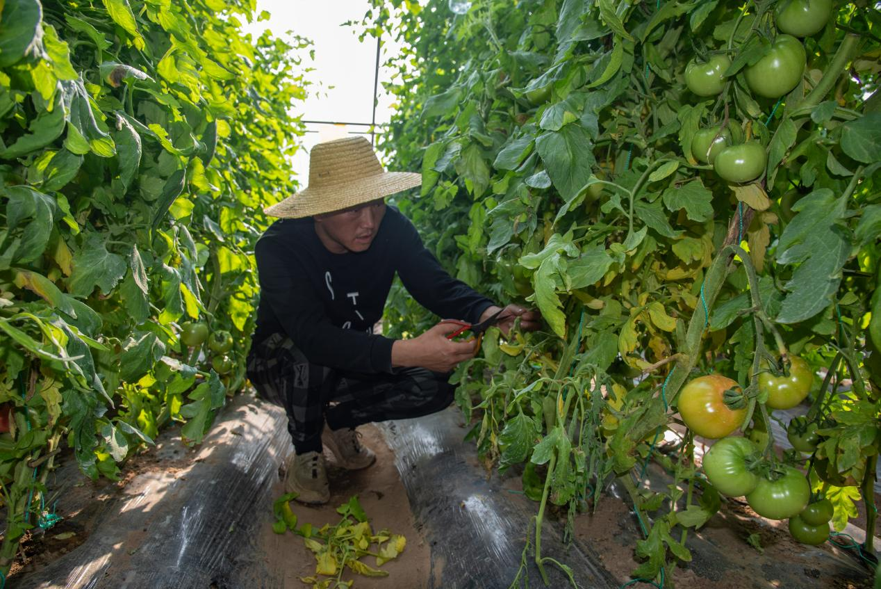 种植户在大棚内进行西红柿管理作业(楚向东 摄)