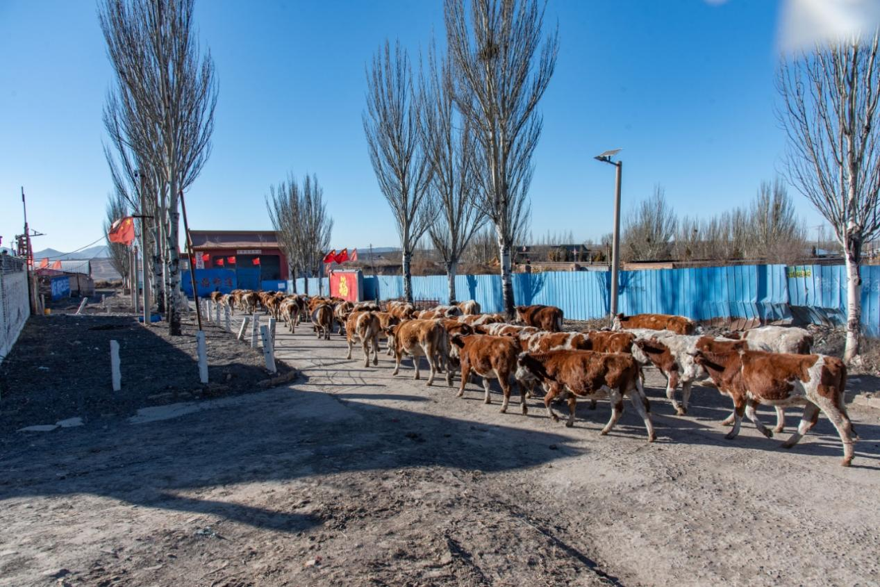 成群肉牛在场区道路上有序行进(楚向东 摄)