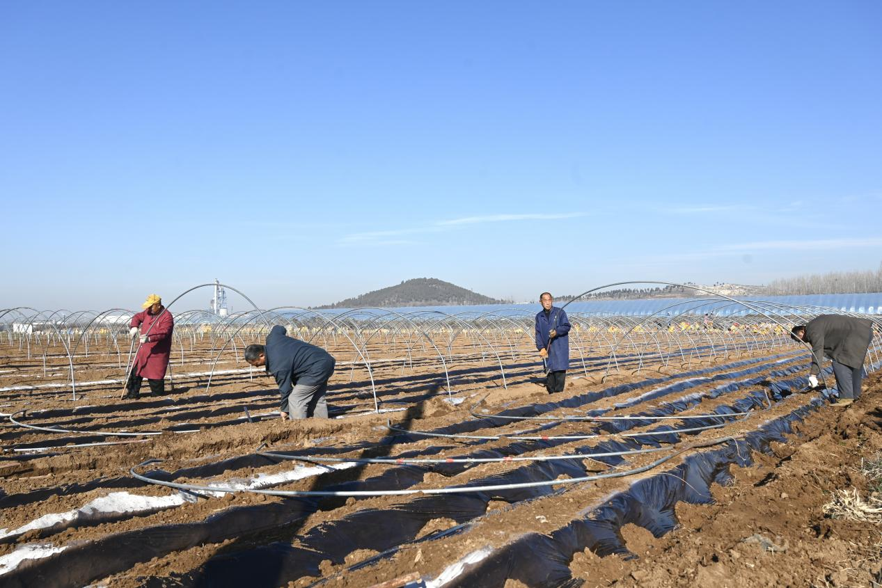与传统种植不同,这里的马铃薯享有“特殊待遇”。在不远处的三良村地块,种植能手鲍庆柱正带领村民为刚播种的土地搭建内拱棚。“四层膜,就像给土豆穿了四件保暖衣。”他一边固定薄膜,一边向旁边学习的年轻人讲解,“从保墒增温的地膜,到紧贴苗的‘小棉袄’拱棚,再到遮风挡雨的大棚膜,层层防护,数九寒天棚里也能保持十五六度。”