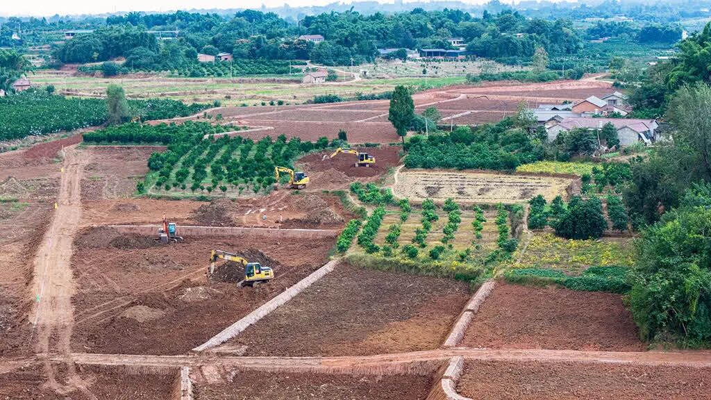 站在富牛镇曾庙村的田埂上,村党委书记张华明指着眼前开阔的工地露出笑容:“收割机终于能开进来了!”在他身后,推土机正将零星地块推平,崭新的沟渠轮廓初现——这片曾因分散导致机械无法下田的土地,即将蜕变为集中连片的高标准农田。张华明的感慨,道出了四川眉山东坡区许多农户的心声。