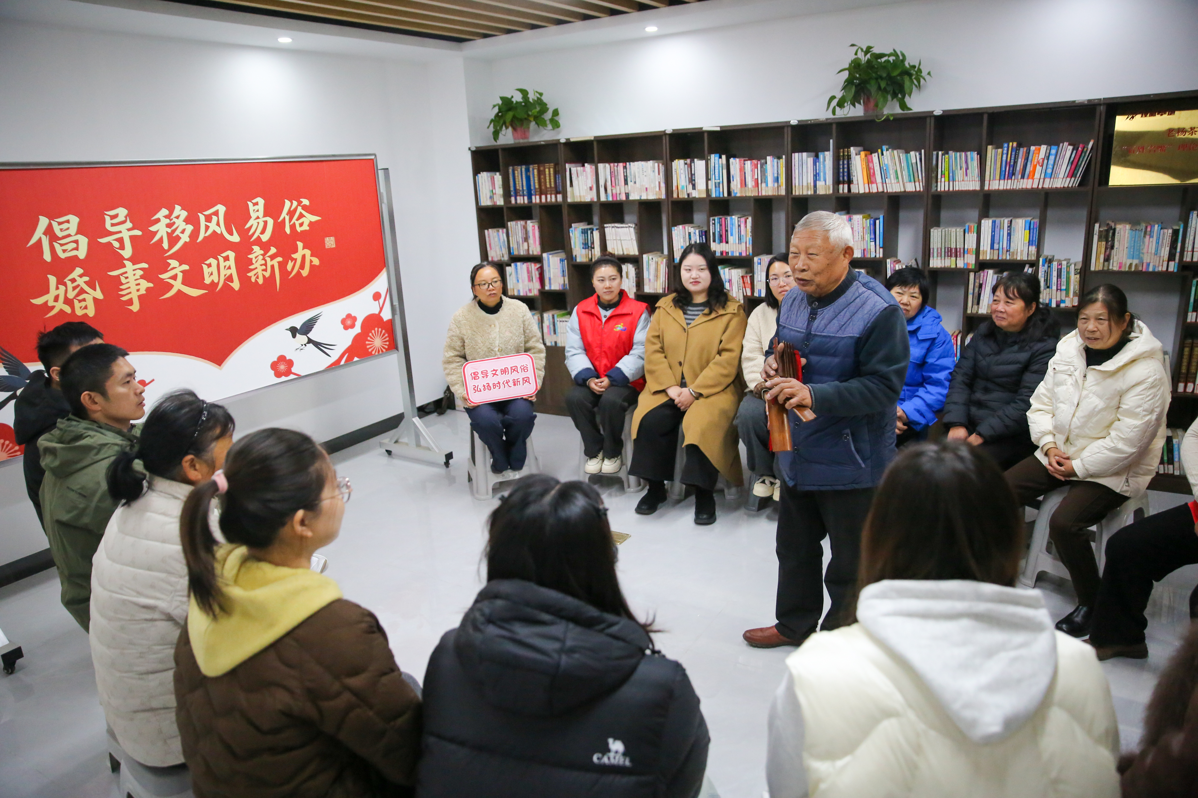 为深入推进移风易俗,引导辖区居民树立正确的婚恋观和消费观,破除婚事办理中的陈规陋习,近日,一场以“倡导移风易俗,婚事文明新办”为主题的实践活动在江苏省如皋市城南街道平明社区的书屋内生动开展。通过生动鲜活的文艺形式与真实可感的实践案例,为辖区居民献上了一场别开生面的文明新风课。为增强宣传效果,使文明理念更易理解和接受,活动设置了“艺韵传新风”与“实践树榜样”两大特色环节。