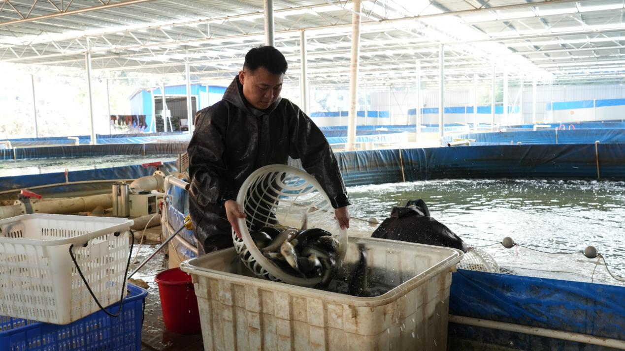 近日,记者走进广西桂江生物科技有限公司夏郢养殖基地,60个陆基圆形养殖池置于大棚之内,工人身着专业的捕鱼服,动作娴熟地将大口黑鲈从池中捞起,然后挑选、称重、售卖,每一个环节都充满了丰收的喜悦。