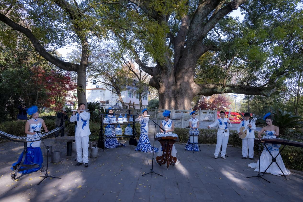 景德镇学院“磬音”瓷乐团在旸府滩社区古樟下演出(赵子淞 摄)