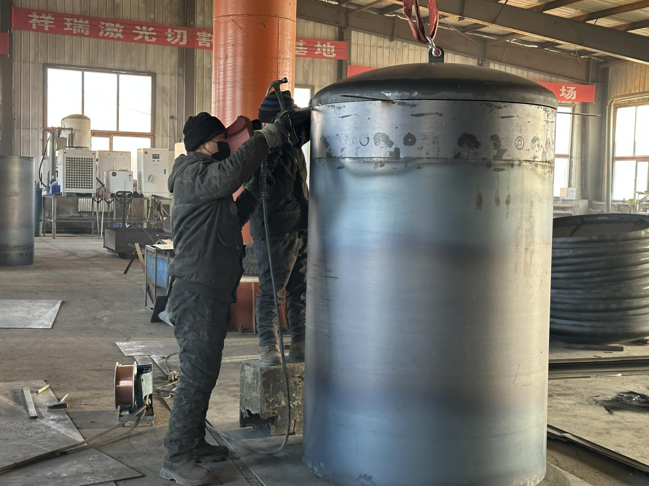 在加工车间的抗旱水桶生产区域,工人们正熟练地操作着剪切机、折弯机、焊接机等设备,一块块钢板经过精准裁剪、折弯成型后,再通过焊接工艺组装成一个个结实耐用的抗旱水桶。“这些抗旱水桶采用加厚钢板制作,抗冻抗压能力强,能满足不同地块的灌溉需求。”现场操作的相关工作人员介绍。进入冬季后,农户们纷纷提前储备农业生产物资,抗旱水桶作为春季灌溉的关键设备,成为订单中的 “抢手货”。