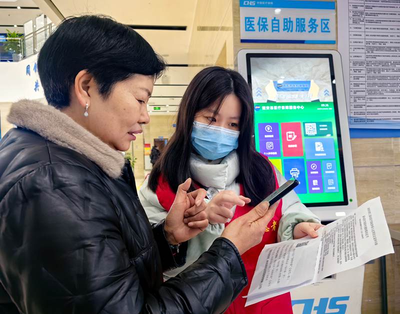 工作人员正在指导群众手机缴纳医保(周亮 摄)
