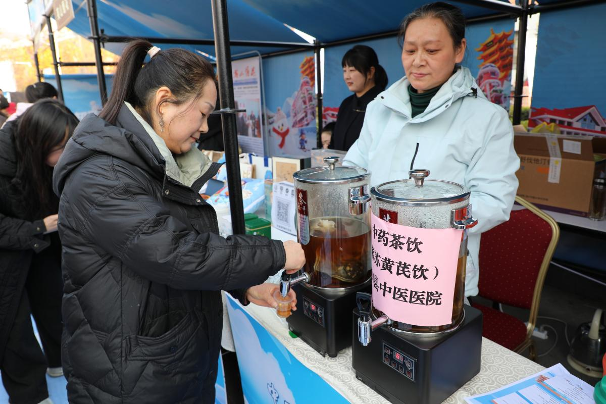 在洪广酒店广场专门开辟的健康服务区,英山县卫健局精心设置了4个特色中医药服务展位,构成一道别具韵味的“健康风景线”。县卫健局党组成员、县计生协会会长万军现场介绍:“我们统筹毕昇健康产业公司(英山县毕昇健康产业有限公司)、县医共体总医院中医医院院区和石头咀镇分院以及在本省药膳大赛中表现优异的三家餐饮企业,携手为活动提供涵盖中医问诊、中药文创、养生茶饮、药膳品尝、温泉康养等一体化服务,让市民和游客‘零距离’感受英山中医药的独特魅力。”