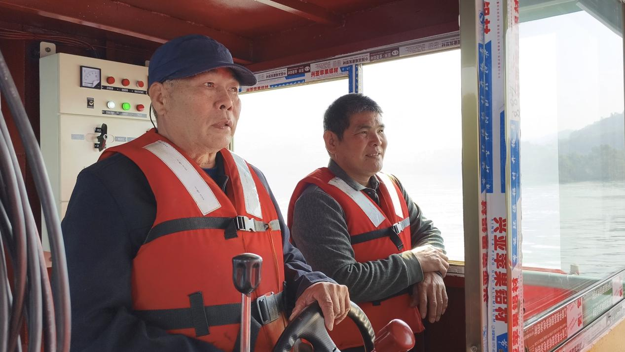 武宣县二塘镇朗村渡运旧船主方绪其(左)到船舱体验新船(向国华 摄)