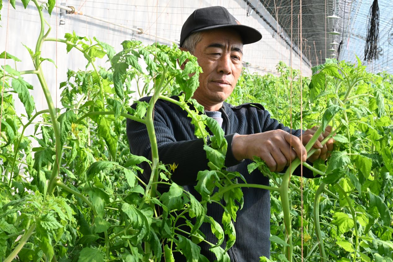 村民在大棚为西红柿苗打叉(张涛 摄)