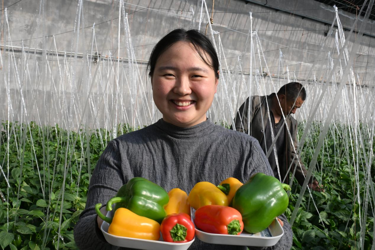 村民在展示刚采摘的三色彩椒(张涛 摄)