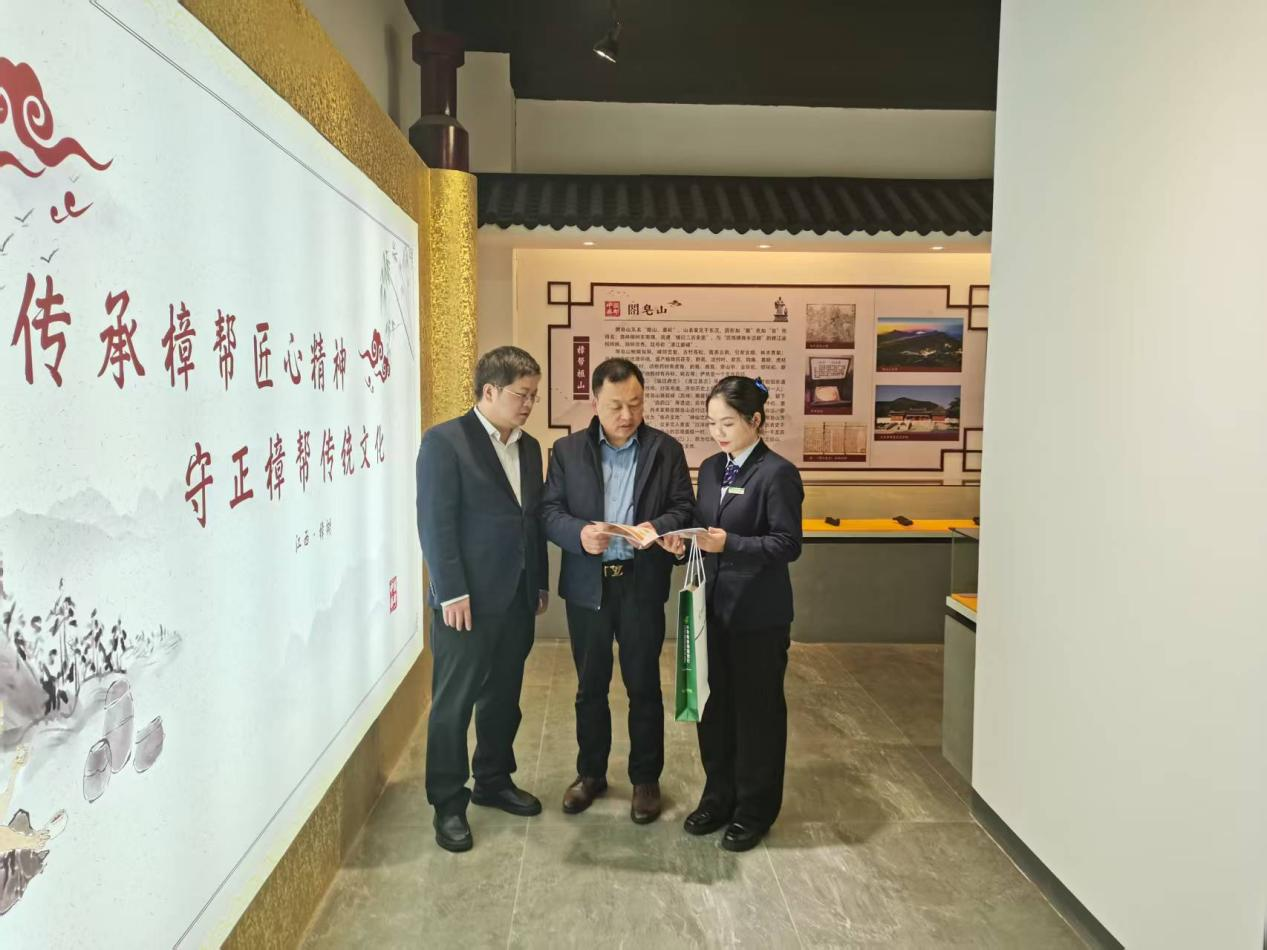 国都中药董事长张雄(中)向邮储银行员工介绍企业经营情况(谢新民 摄)