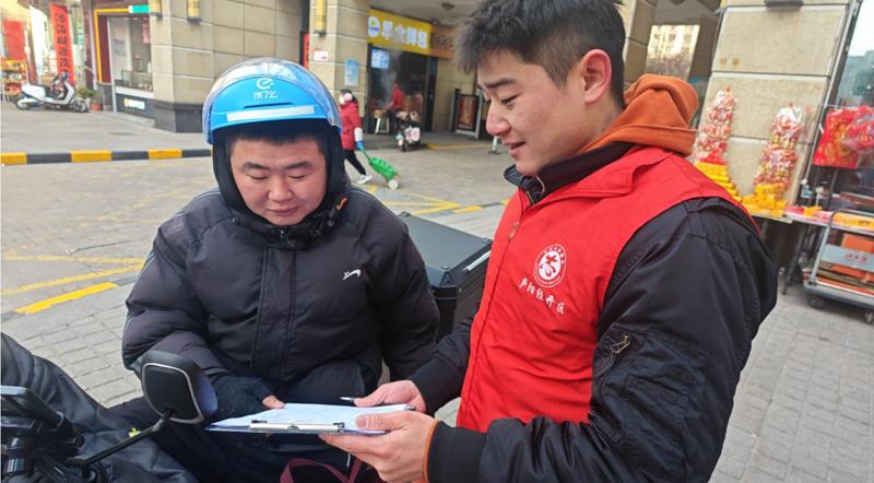社区网格员向快递骑手征集商圈治理建议 (赵明 摄)