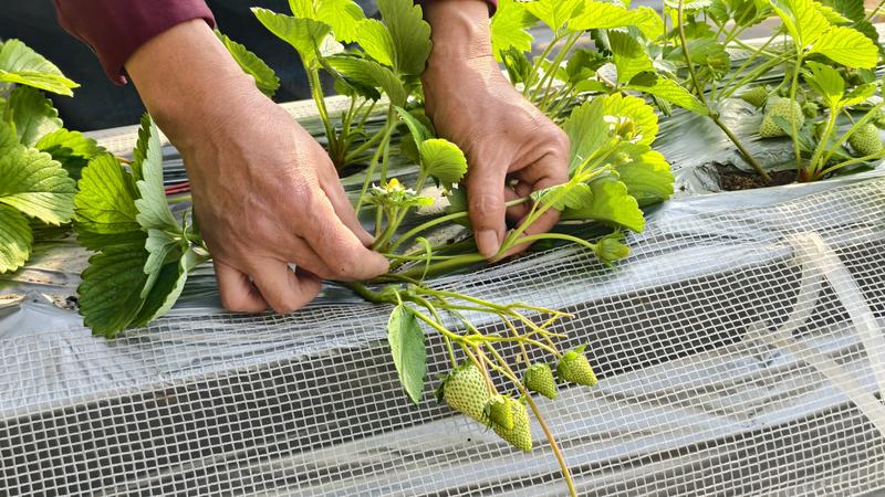 工人对草莓植株进行整理疏果(杨润德 摄)