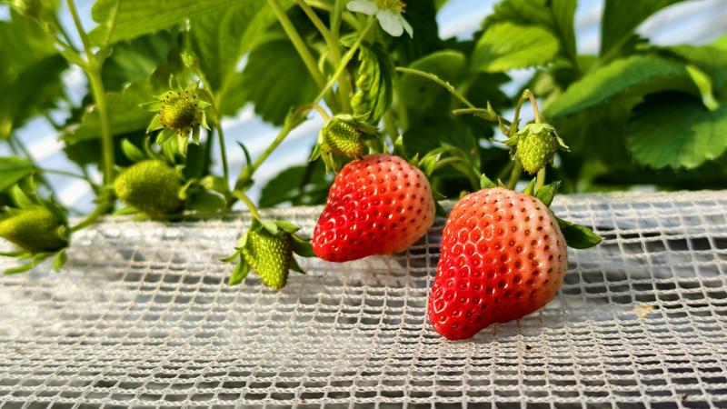 棚内还配备了数字化智能系统,实现高效无土栽培与远程智能管理。通过手机即可操控新式卷帘机,自动完成通风、保温等操作;温湿度、光照实时监测并自动调节。配合净化水设备和水肥一体化滴灌系统,不仅节水节肥、省工省力,也让草莓品质更加稳定,果色鲜亮、口感清甜。