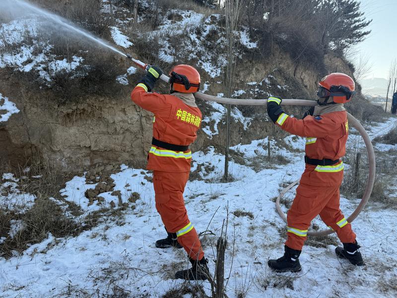 救援队员进行操控水带开展扑火实训(席兆平 摄)