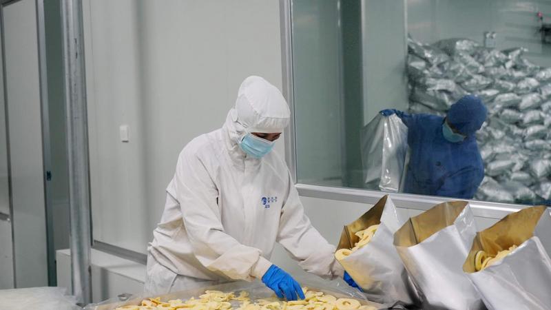 12月23日,走进企业生产车间,自动化生产线有序运转,工作人员身着防护服,严格按照食品生产规范有序作业。从周边果园收购的新鲜苹果,经过分拣、清洗、去皮、去核、切片等预处理后,进入零下40摄氏度的速冻仓冷冻6小时以上,再转入真空冻干仓,通过升华技术去除水分,最终变成色泽自然、口感酥脆的冻干苹果片,最大程度留存鲜果本味与营养。