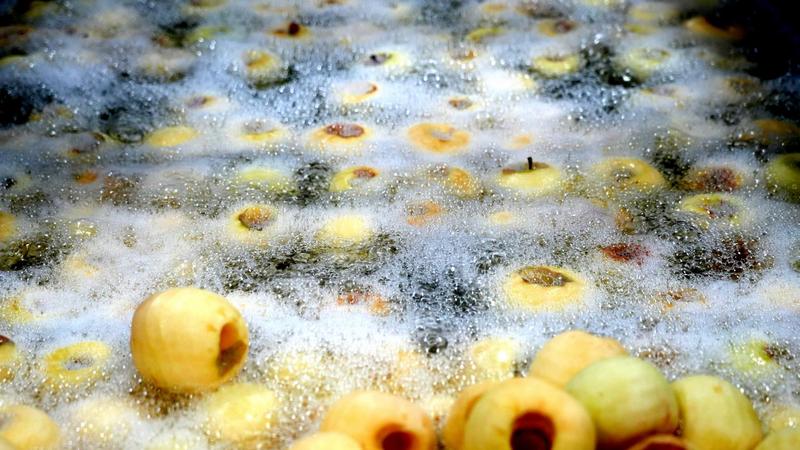 在阿克苏冰萃生物科技有限公司生产车间,一颗颗经过去皮的苹果正在进入清洗工序。(赵新昌 摄)