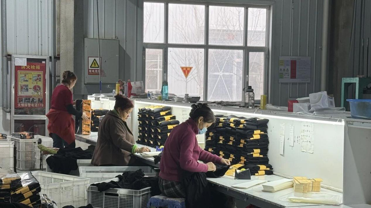 车间内,工人分拣打包袜子,生产忙而有序。(祖丽皮耶 摄)