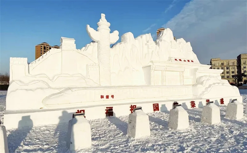 集贤县七星广场雪雕“祝福祖国”(雷琳 摄)
