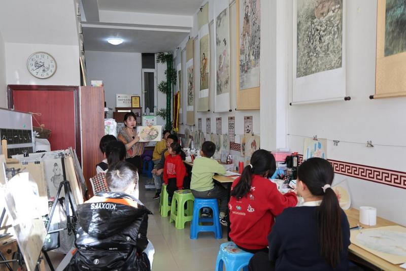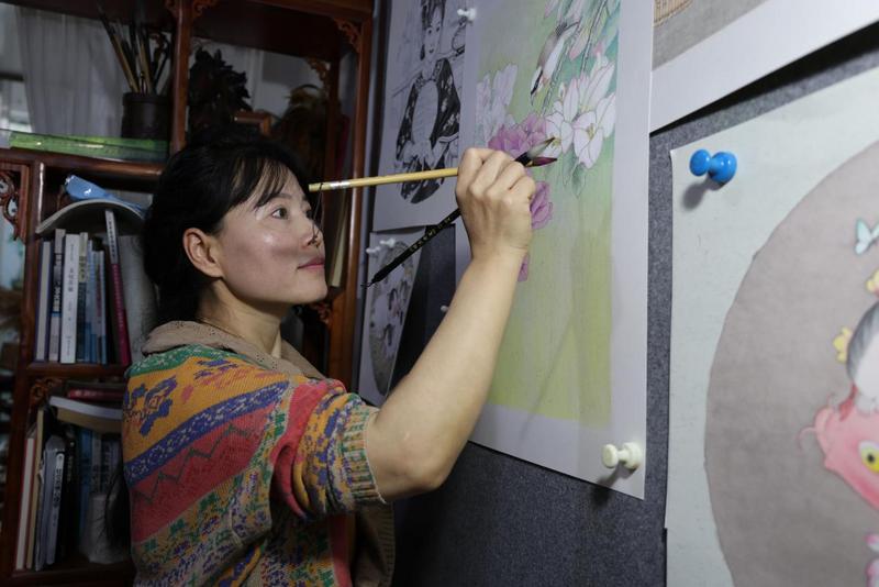 “由颜色重的地方下笔,然后再反方向过渡。”见到吴金莲时,她正手持课件,耐心地为学员们讲解工笔画的着色技巧。画室的墙上,挂满了吴金莲的画作,作品题材丰富,人物鲜活传神、花鸟灵动如生、山水雅致清幽,每一幅都尽显精湛功底与匠心独运。