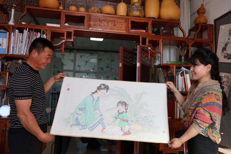 小街基镇妇联主席张玉红(左)发现吴金莲并帮她在镇里举办过个人画展(杨贵强 摄)