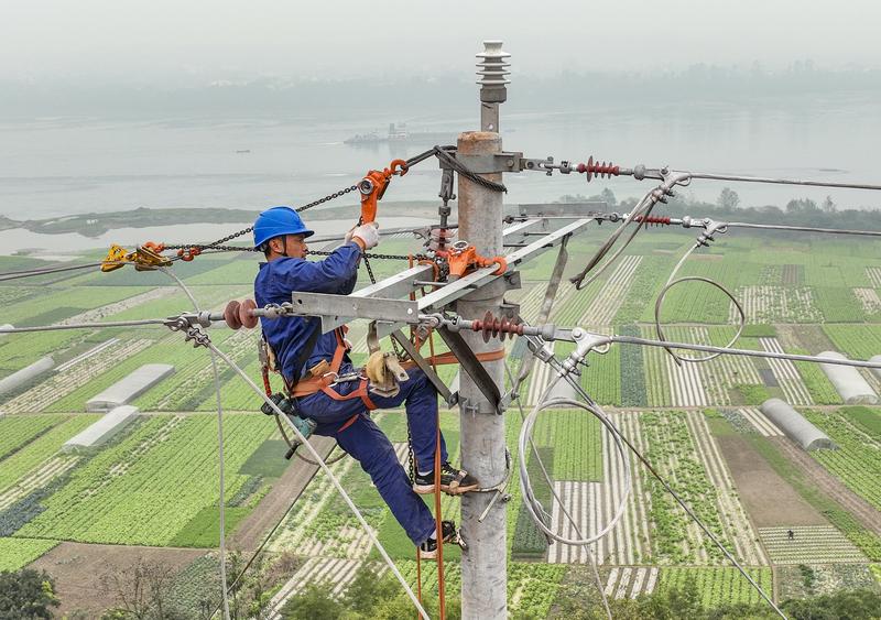 2023年12月9日,国网泸州供电公司员工在10千伏况石线57号杆开展线路检修。(马宁果 摄)
