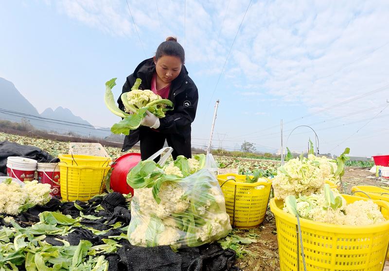2025年12月30日,走进广西贺州市平桂区羊头镇羊头村松花菜种植基地,村民们穿梭在翠绿的菜田间,手起刀落,一颗颗洁白饱满的松花菜被迅速收割、分拣、装筐,准备发往广州、深圳等地。欢笑与忙碌交织,菜农们正用实实在在的丰收,迎接新年的到来。