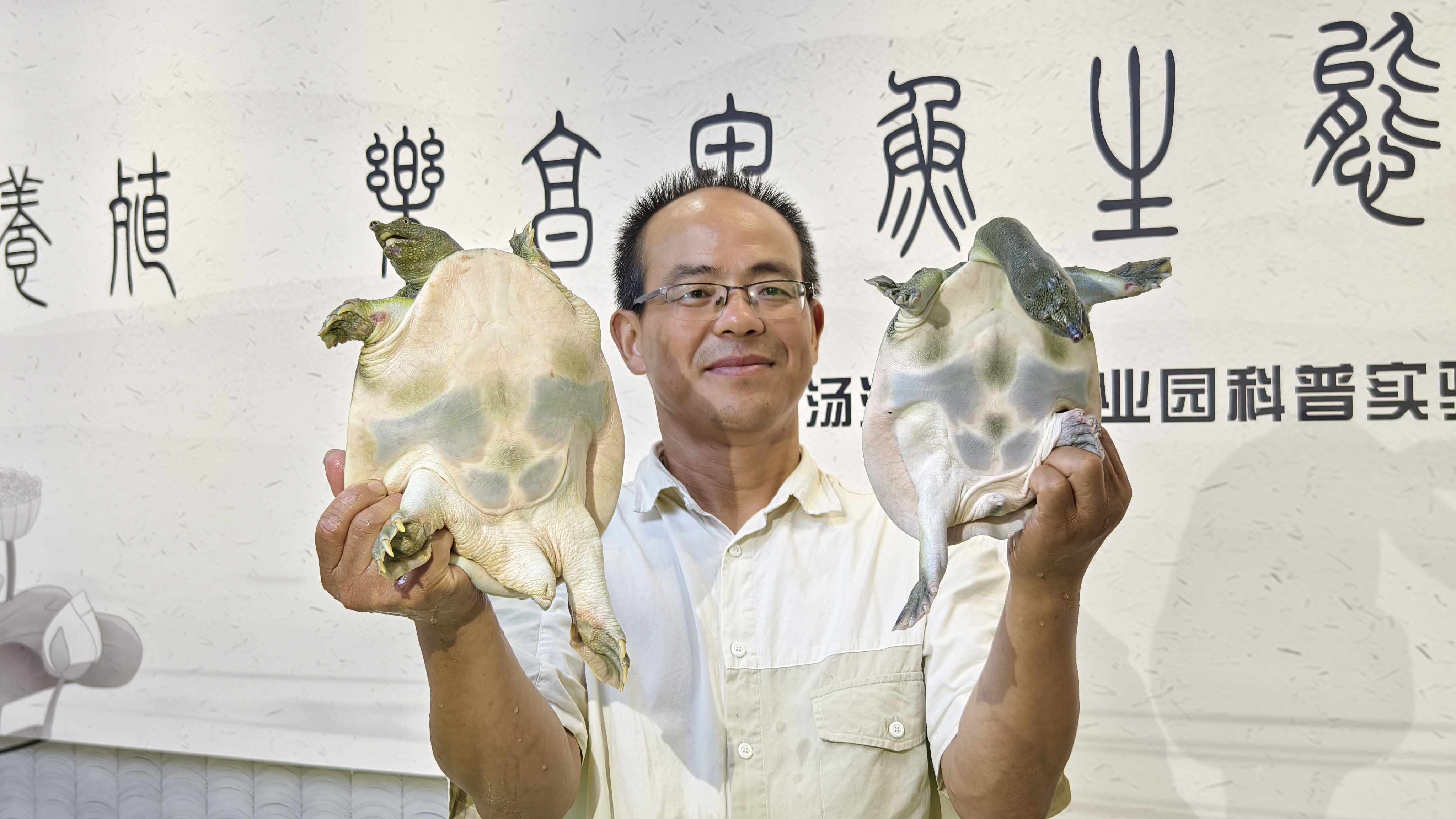 甲鱼养殖户骄傲地举起甲鱼向记者展示(李梦婷 摄)
