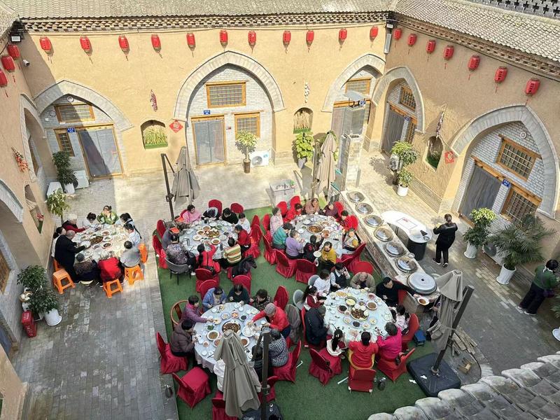 景区的火热态势,也带动了周边窑院民宿的消费热潮。位于景区周边的陕州印象农家乐内,一派忙碌又温馨的景象,临近中午后厨里忙得热火朝天,老板卢有伟穿梭院内,陕州十碗席特色美食陆续送达客人的餐桌。几位游客就餐完毕后前往星光地坑院民宿办理入住,服务员正耐心地讲解着民宿的设施与周边游玩攻略。