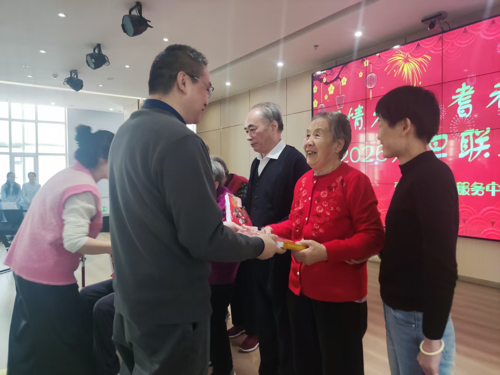 上午10时许,舞蹈《张灯结彩》拉开了活动帷幕。工作人员身着节日盛装,曼妙的舞姿传递新年祝福,瞬间点燃现场气氛。随后,歌曲、文艺节目、乐器演奏等精彩节目轮番登场,既有经典老歌《打靶归来》《朋友》《在那遥远的地方》引发全场共鸣,也有老人们自编自导的手语《金龙拍拍操》,老人打击乐《爱我中华》,用朴实直白的语言讲述入住以来的生活变化,言语间满是对中心服务的认可与对幸福生活的满足。颁发礼品环节把联欢会推向了高潮,老人们接过喜爱的礼品,笑得合不拢嘴。