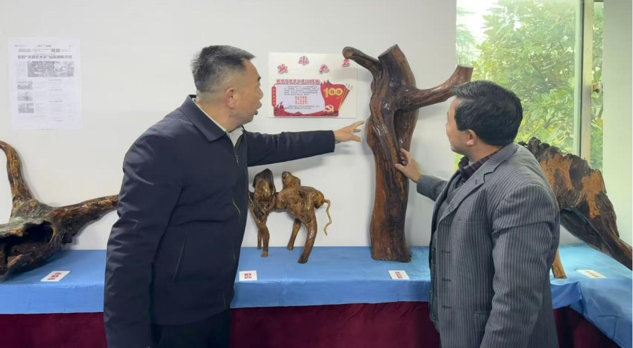 走访首站来到谷保村农民艺术家、共产党员陈景明的根雕馆。馆内木香萦绕,陈景明向孔祥鹏展示了献礼建党百年的根雕作品。四十载深耕乡土,他以刀为笔、以根为纸,将山间枯木化作乡土题材艺术品,并建成免费文化驿站传承乡土文化。孔祥鹏鼓励他深挖王英红色故事,让乡土文化焕发时代活力。