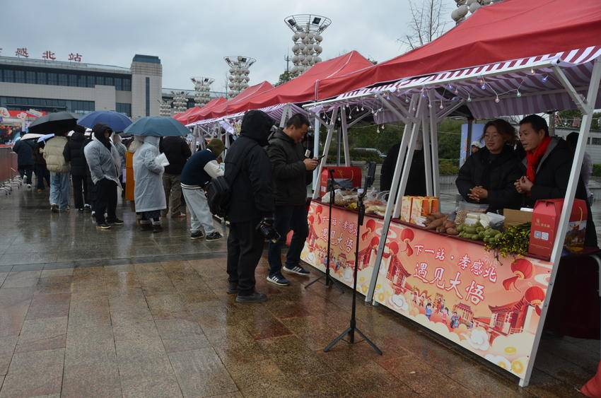 广场两侧,30余家农产品展区,茶叶、土猪肉、红薯粉等特色农产品吸引市民抢购;孔雀山庄的烤全羊香气扑鼻,美食展销区20余家商家的米酒、麻糖、炕饼子、羊肉串、麻花等美食挤满了品尝选购的市民游客。两天时间,“下一站·孝感北”文旅IP吸引线上线下观众超1亿人次。