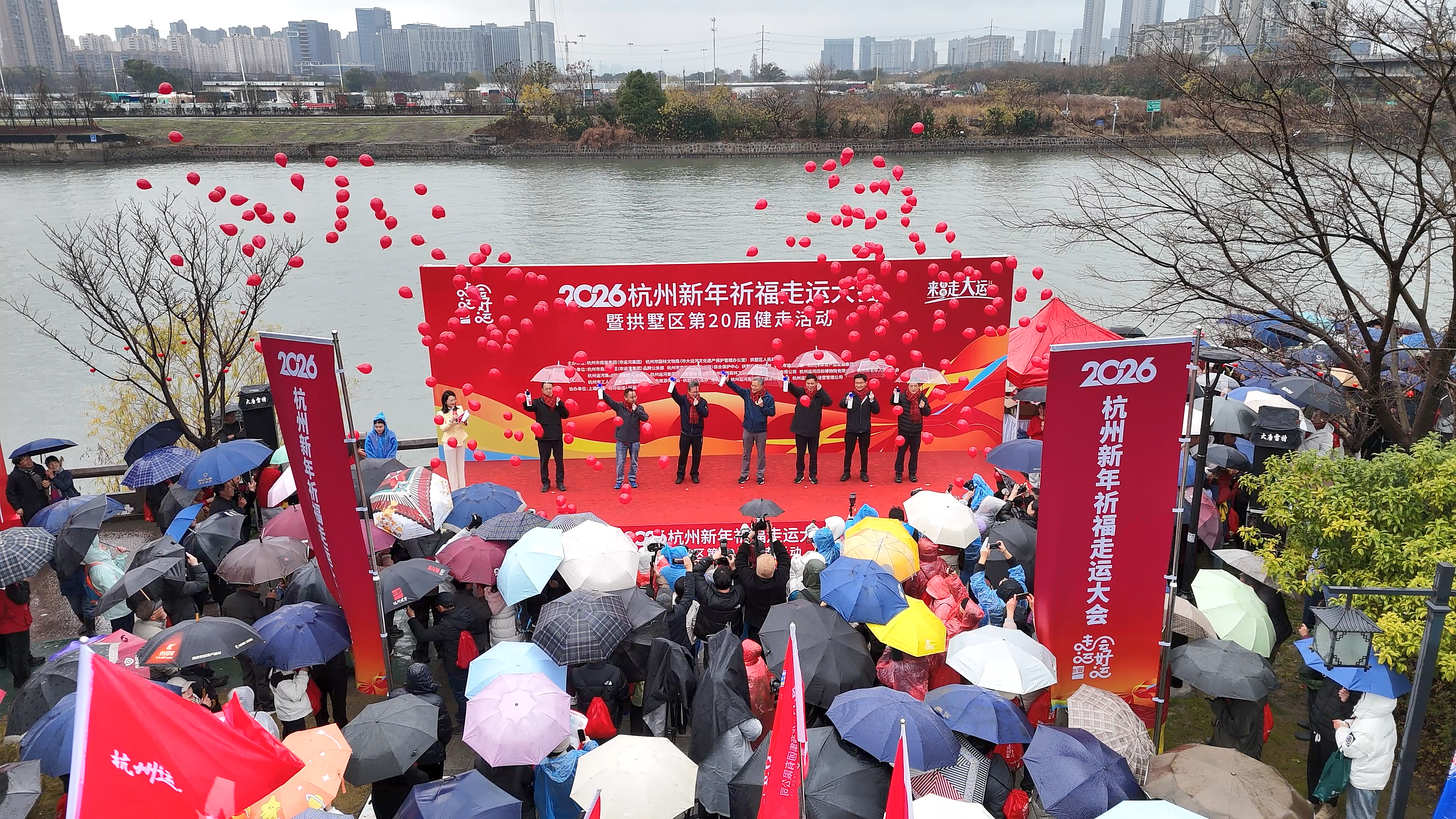 来浙江杭州,走大运(河)。新年第一天,一场在杭城持续了十年的城市迎新活动再度温暖启幕——2026杭州新年祈福走运大会暨拱墅区第20届健走活动燃情开走,象征鸿运的气球伴着响亮的鸣笛声腾空而起,寓意鸿运当头、马到成功。