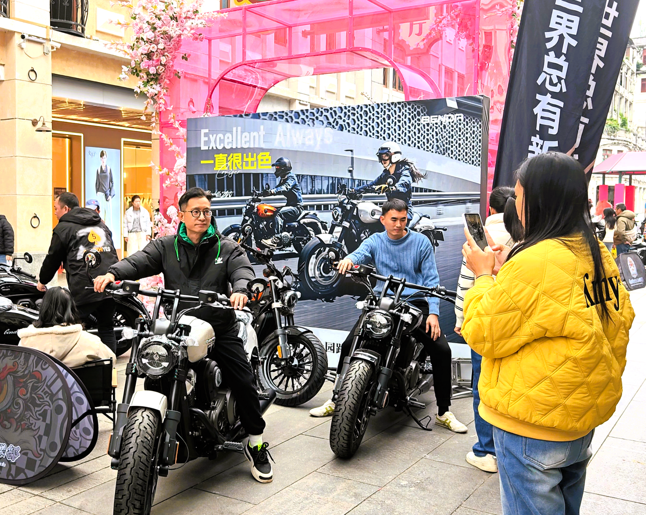 骑楼城内布设机车展,市民体验车型并拍照打卡。(麦好明 摄)