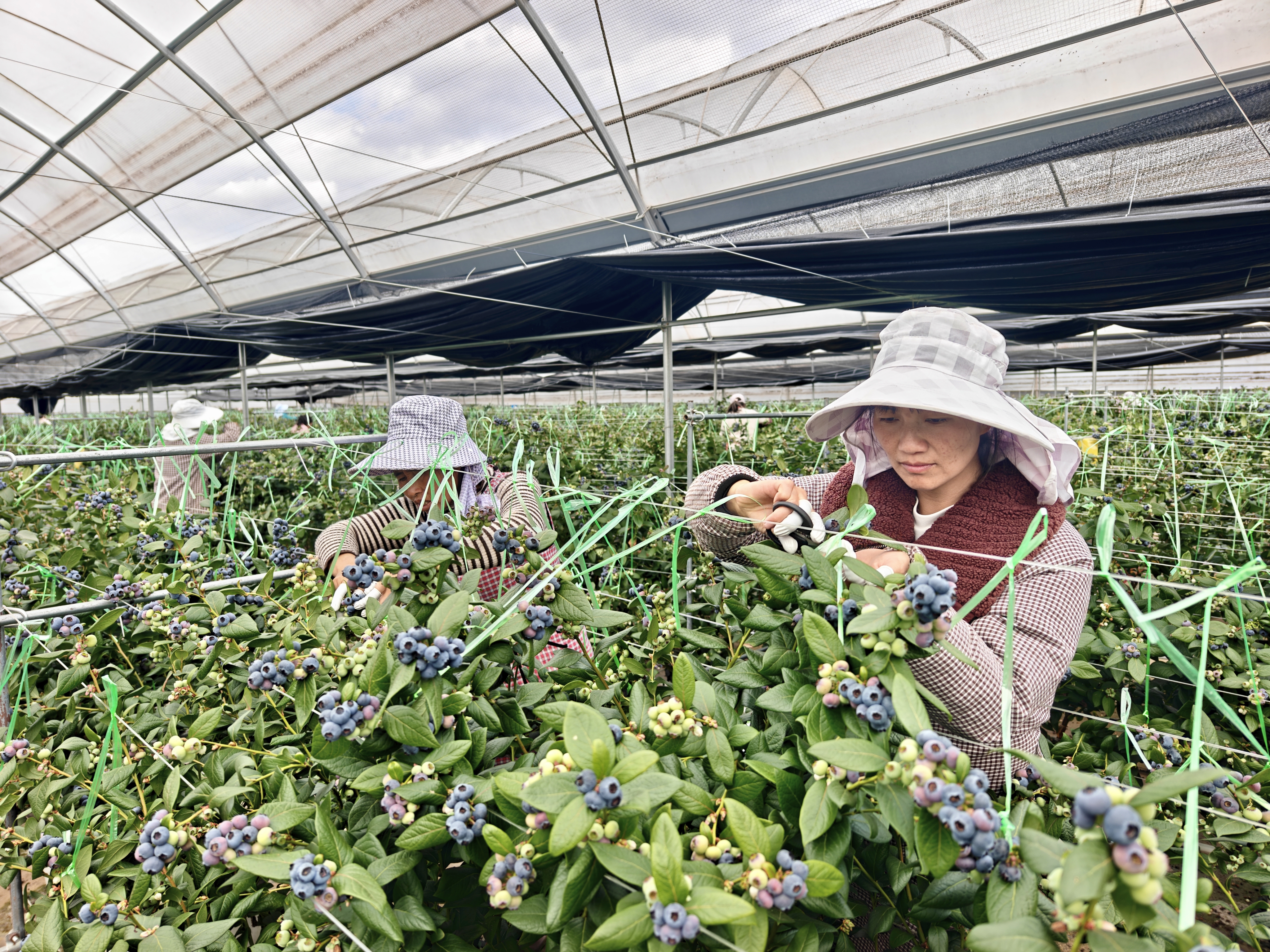 产业要行稳致远,人才是核心引擎。禾益农业基地厂长窦中伟介绍,当前蓝莓已进入采摘旺季,基地每天在采摘、分选、包装等环节的用工量稳定在150人左右,这些工人清一色是附近的村民,采摘旺季将一直持续到今年3月。“2025年我们的劳务费用预计要支出500万元,让大家实实在在赚到钱。”窦中伟说,为了让村民从“临时务工者”成长为“专业技术工”,公司每年还拿出近50万元,开设种植管理、病虫害防治、果品分选等专项培训,手把手培育本土化专业人才队伍。“从普通工人到基地管理岗、技术岗,我们都优先选拔本地群众。这样一来,既解决了企业用工不稳定的难题,也让村民掌握了一技之长,就算以后不在基地干,凭手艺也能找到好出路。”