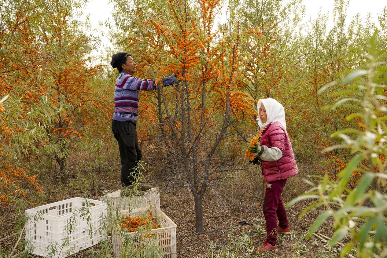 丰收时节村民采收沙棘果(邵宏娜 摄)