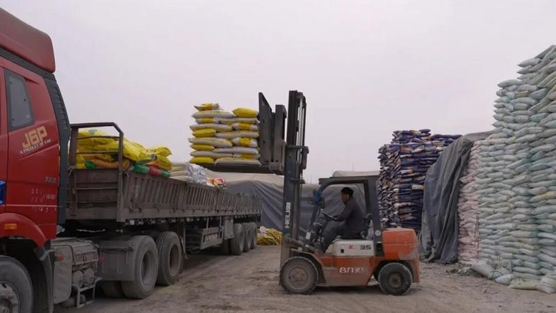 在新疆众联普惠农业服务有限公司储货场地,多辆运输车辆正有序装卸化肥。工人们忙碌地将化肥转运上车,经销商张杰在现场核对货物、监督装运,确保流程稳妥有序。张杰说:“这里农资品种全、质量可靠,我经常来采购。今天先运走5吨,后续还会继续备货,为春耕提前准备。”