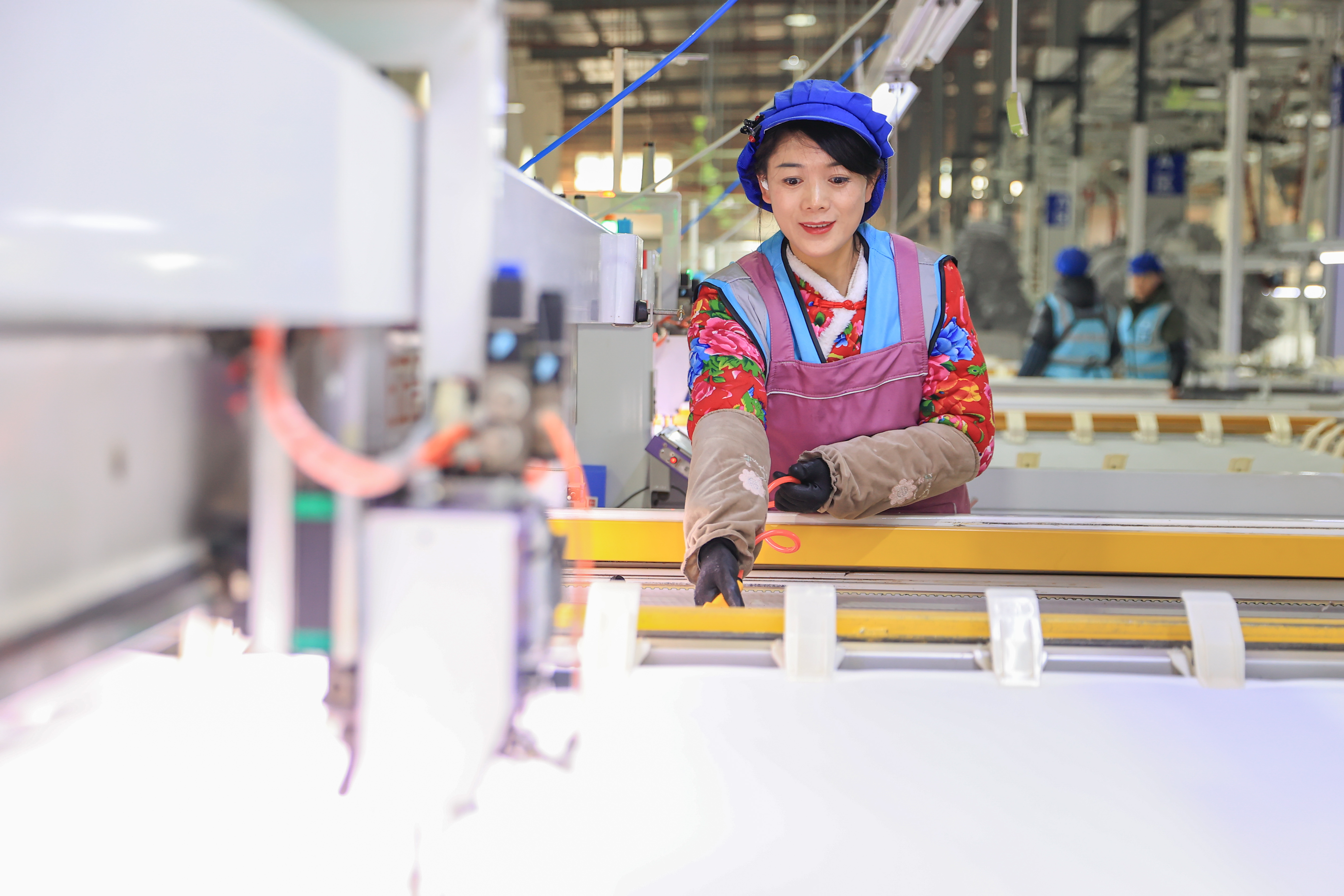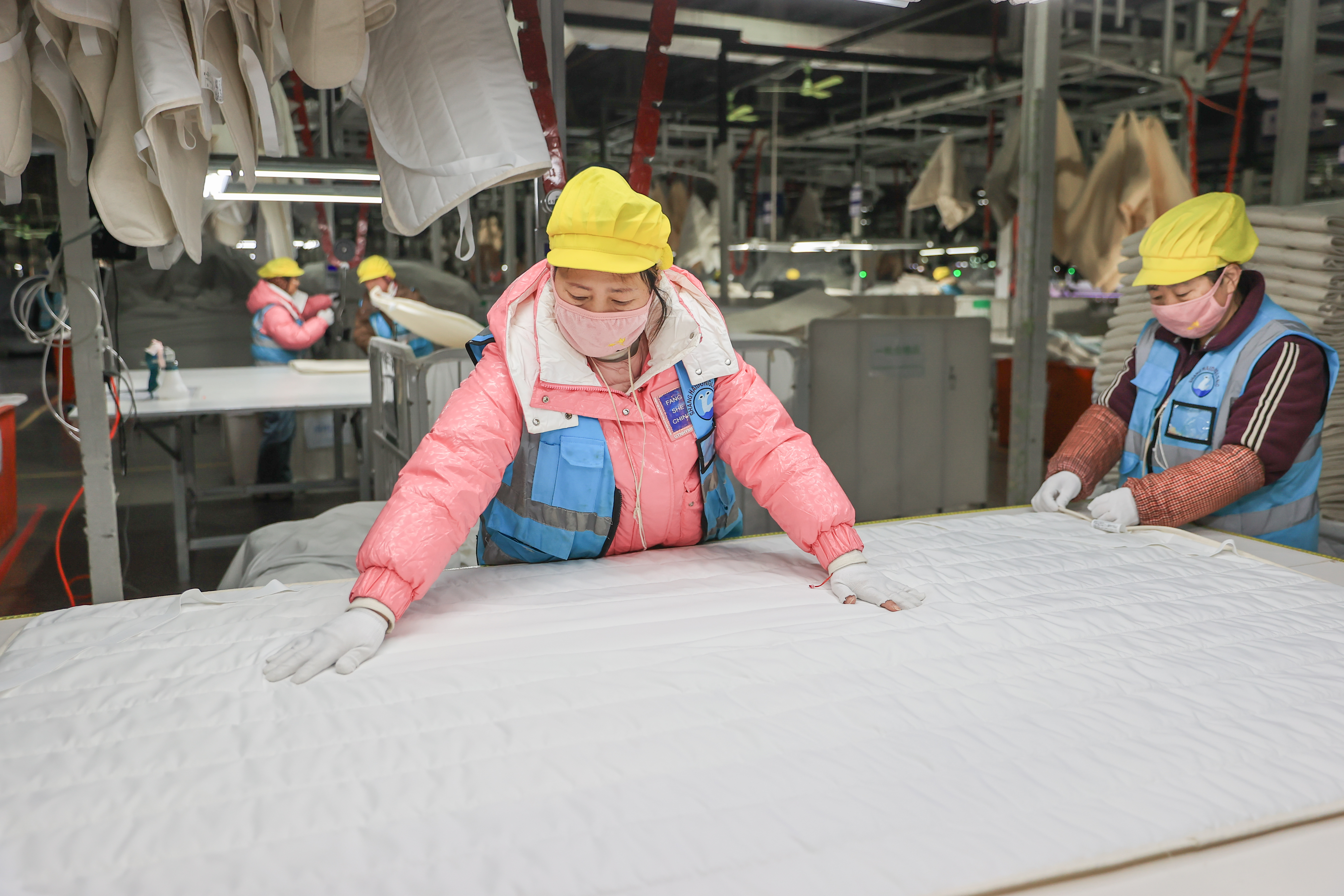 1月5日,在赣榆区金山镇连云港新东方家纺有限公司生产车间,工人在生产线上忙碌。(司伟 摄)